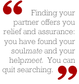 Finding your partner offers you relief and assurance: you have found your soul mate and your helpmeet. You can quit searching.