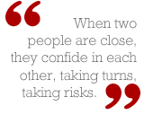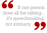 Intimacy Is Communication X: "Oops, excuse me."Such "communication" is so automatic it may seem meaningless. In response to "How are you?," should you really describe your health? Probably not -- probably the questioner only wanted to greet you and keep going, so just respond with "Fine" and go your way. Such verbal habits smooth our social pathways, and maintain acquaintanceships, even though they have no real content. But close communications do require content. When two people are close, they confide in each other, taking turns, taking risks. Over time they trust each other. They try to communicate clearly and work hard to patch up differences when there are misunderstandings. X: "Is anything wrong?"It's been said that everything we do in our interactions with close others is some form of communication: speech, silence, gestures and certainly sex. We don't just communicate in order to get close; we seek closeness in order to have close communication. Recall that at the beginning of this course, we reviewed how people who are close to others are demonstrably happier and healthier than those who have no close others. One explanation for this is that communicating is good for us. People with partners have someone to talk to and listen to. They can say what's on their minds, talk about things that really matter, not just make polite conversation. Healthy communication must be a two-way street: if one person does all the talking, with no clear understanding or sharing from the other, it's speechmaking, not intimacy. But even two caring people aren't always in sync. Their moods, worries and even language can be different. At such times, all their good intentions won't prevent misunderstandings and dissatisfaction. In this lesson, we'll examine the basic processes of communication, the key elements in good communication, and pitfalls in poor communication. We'll also examine the hypothesis that males and females learn to communicate differently-sometimes so much so, that communicating across gender lines is like two people speaking different foreign languages. Before going on, however, let's examine the beginnings of closeness. How do conversations move from friendly to intimate? |