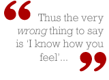 It seems harder to understand how real friends or family could diminish grief over miscarriage. Studies of expectant individuals and couples confirm that the child is subjectively real, a child of the future, symbolic of love, hope and intimacy. Plans have been made, supplies and toys have been purchased. The death of the hoped-for child is the death of hope. Even if miscarriage was anticipated, as with a sick or distressed fetus, especially for a pregnant individual, this is literally grief that must be carried, both borne and born. It seems impossible to understand what that feels like. Thus the very wrong thing to say is "I know how you feel" -- "-even another survivor of miscarriage wasn't expecting this baby, and so the assertion isn't true. Remarks such as "You can have another" or "...get another" or "At least it wasn't too far along" are inevitably unwelcome, even enraging. Better to say nothing than try to tell the parents this pregnancy meant nothing.