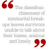Perhaps the most common case of disenfranchised grief is grief over nonmarital breakup, the kind of relationship loss that happens many times for every legal divorce. Whether you were the breaker or the breakee, if the relationship was integrated into your life (typically after about two years of closeness), the loss is psychologically real, and entails genuine grief. Even short-lived relationships involve a loss of hope or a loss of face; social discomfort; embarrassment; depression; guilt or mistrust. Again, well-intentioned outsiders might offer consolation such as "Good thing you weren't married," or "Better to find out now." But it doesn't feel "good" or "better." The disenfranchisement of nonmarital breakups leaves survivors unable to talk about their losses, anxious and lonely.