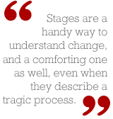 Stages are a handy way to understand change,and a comforting one as well, even when they describe a tragic process. Stages tell us what will happen next, and what to do about it. They also create a sense of progress: "I'm all through my denial and anger, now I'm trying to strike a bargain." But Kübler-Ross's original model applied mainly to confronting the end of one's own life. Though helpful in highlighting some of the emotional terrain involved in the loss of a living partnership, it applies less well to divorce or breakups. In those cases, the partner goes on -- but without you. If you were the one who left, guilt might prick your thoughts; if you were the one left, the feeling of rejection can feel quite distinct from anger or depression.